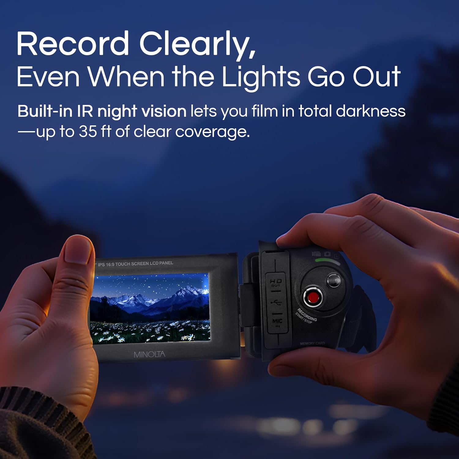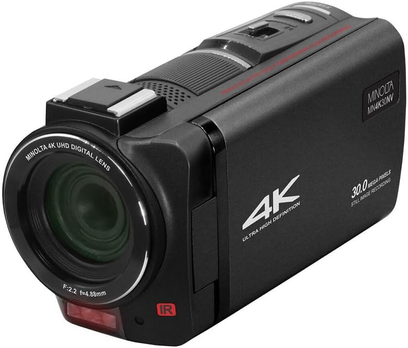 Minolta Camcorder – 4K Ultra HD, 30MP Photos, Night Vision with IR LEDs, 16X Zoom, Time Lapse, Anti-Shake, Touchscreen, MP4 Format, CMOS Sensor, HDMI USB Output, SD Slot (Black)